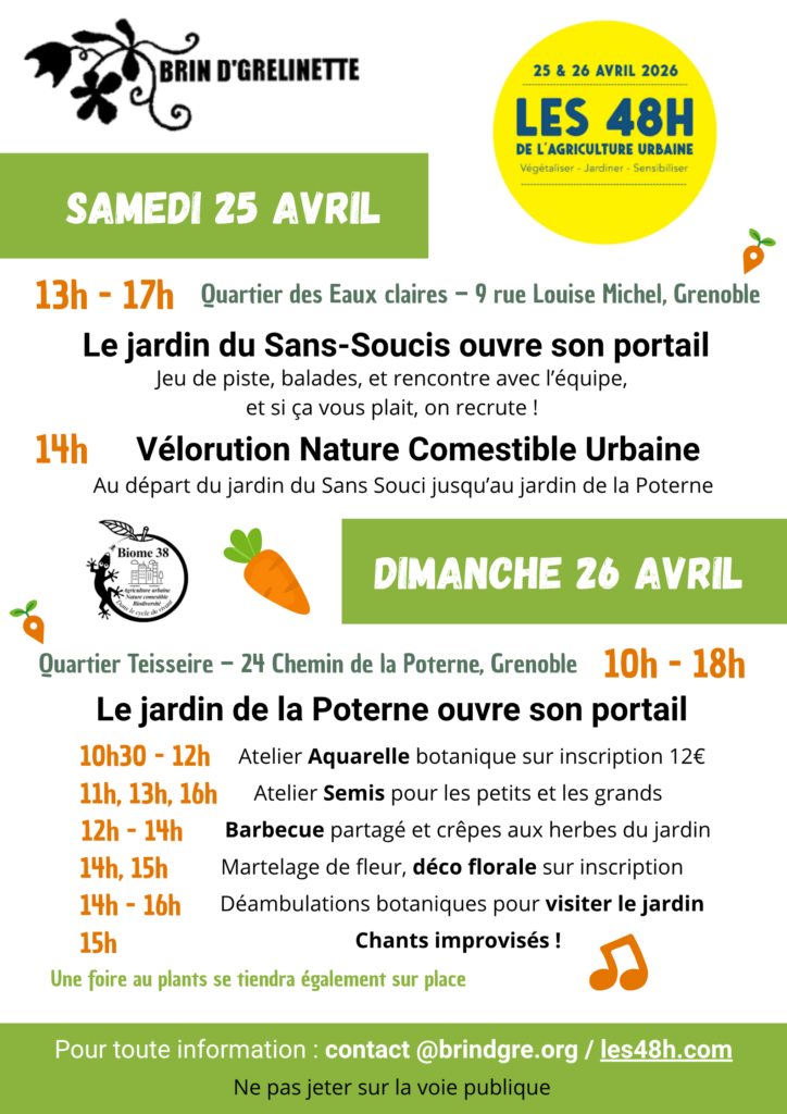 Permanences jardin de la Poterne – le vendredi entre 14h et 17h et le 2ème dimanche du mois (14h-17h)jardin Sans Soucis – le lundi entre 10h et 13hPORTES OUVERTES LE WEEKEND DU 25-26 avril ! Pour découvrir la programmation des 48h sur Grenoble cliquez ici >pour réserver l’atelier Aquarelle du 26 avril de 10h30 à 12h> pour réserver le Chant improvisé du 26 avril à 15h> pour réserver le Martelage de fleur du 26 avril à 14h ou 15h Inscrivez vous en dessous Brin d'actualités géniales Nous n'avons pas pu confirmer votre inscription. Votre inscription est confirmée. Lettre d'information Inscrivez-vous à notre lettre d'infos pour suivre nos actualités. Veuillez renseigner votre adresse email pour vous inscrire Veuillez renseigner votre adresse email pour vous inscrire. Ex. : abc@xyz.com J'accepte de recevoir vos e-mails et confirme avoir pris connaissance de votre politique de confidentialité et mentions légales. Vous pouvez vous désinscrire à tout moment en cliquant sur le lien présent dans nos emails. S'INSCRIRE Brin d'Grelinette contact@brindgre.org16 avenue paul cocat 38100 Grenoble